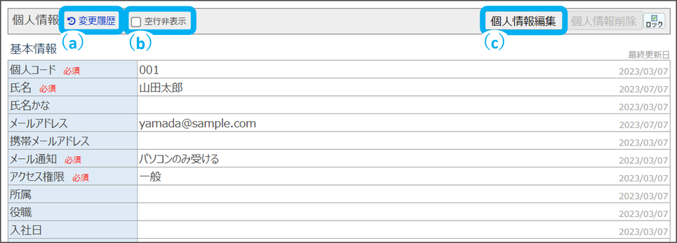 顧客・個人情報の変更履歴(日時・更新者・変更内容等)を確認できます。