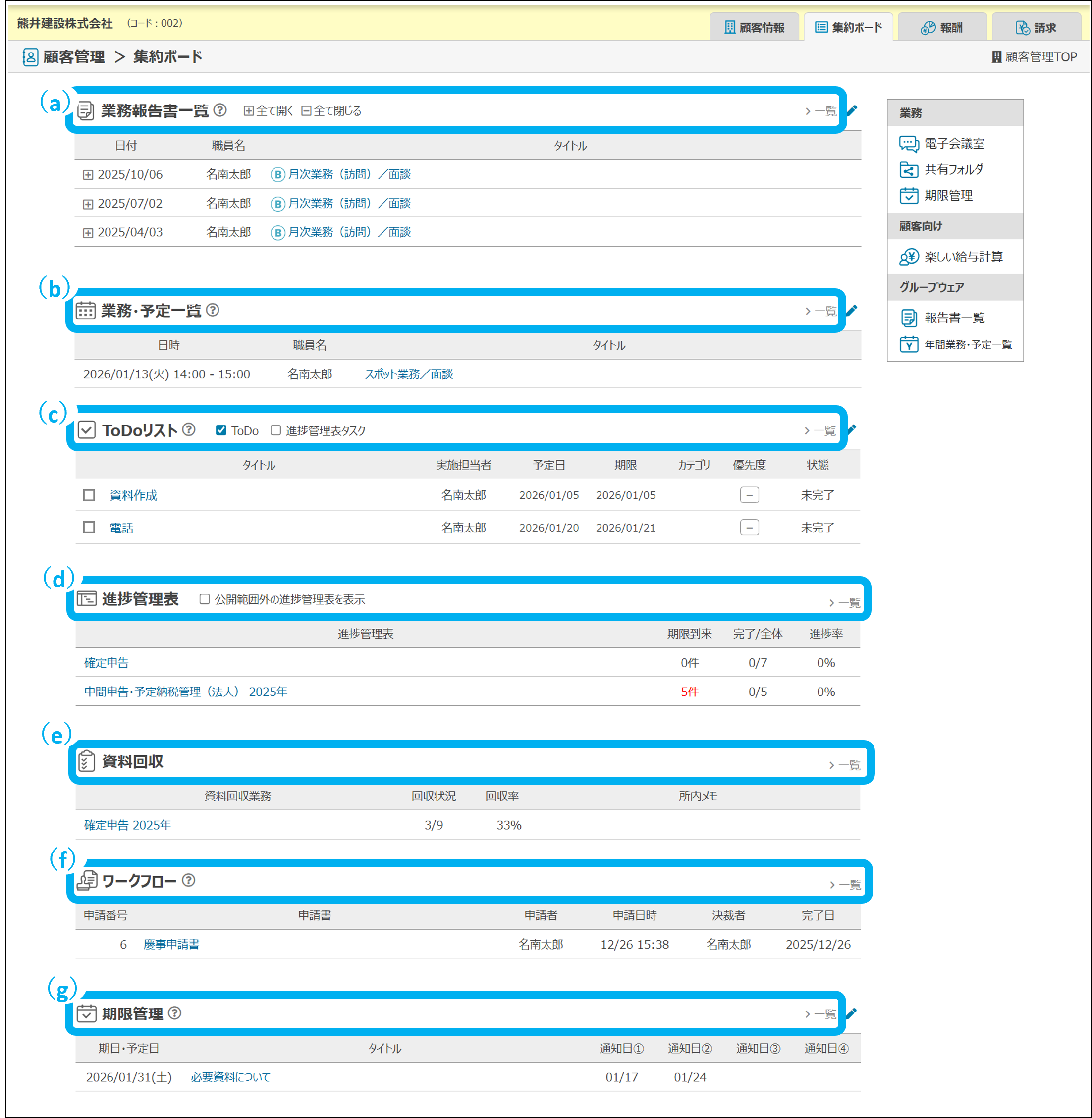 顧客ごとに過去の報告書、予定、ToDoや進捗管理などの情報が一覧で確認できます。