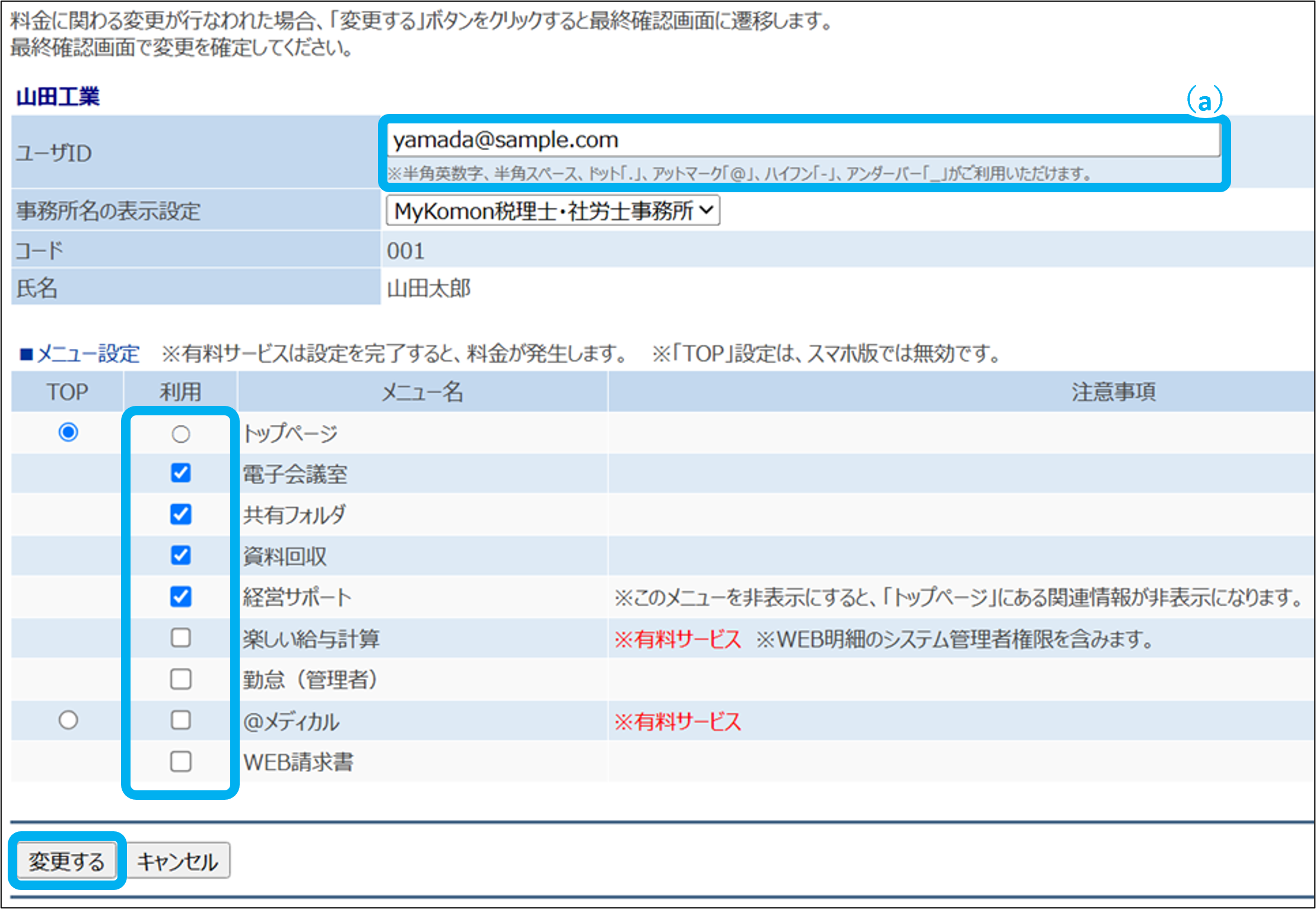 ⑤利用するメニューにチェックし、「変更する」をクリック