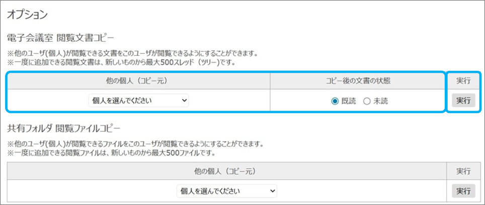 ④「他の個人(コピー元)」と「コピー後の文書の状態」を選択し、「実行」をクリック