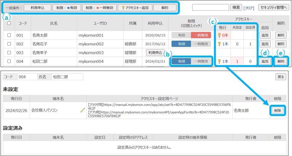 アクセスキーの発行状況の確認や追加、アクセス端末制限の解約をします。