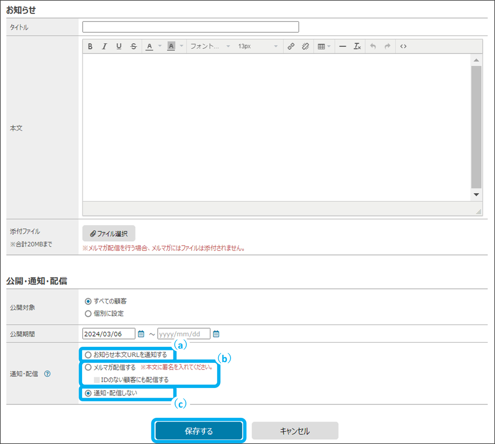 事務所からのお知らせでは、顧客へ情報を一斉配信できます。