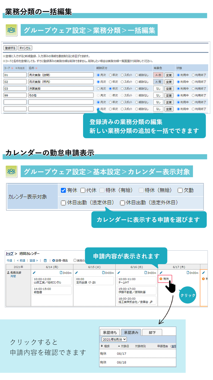請求管理マニュアル(利用準備編、毎月編)、グループウェアマニュアル(利用準備編、活用編)をご覧ください。