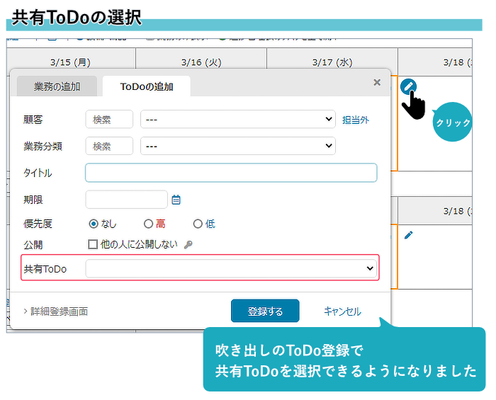 1)吹き出し形式でToDoを登録する時に、共有ToDoを選べるようになりました。