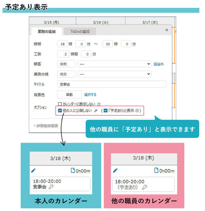 オプションで「他の人に公開しない」を選択した時、他の職員に「予定あり」と表示できるようになりました。業務の内容は非公開のまま、他の職員に予定があることを周知できるようになりました。