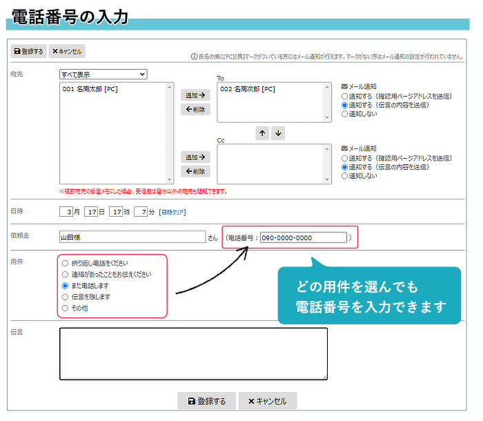 電話番号の入力欄を「依頼主」の右側に移動しました。「用件」でどの項目を選択しても電話番号の入力欄が利用できるようになりました。