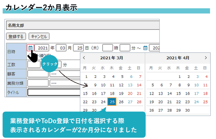 グループウェア内で日付を選択する際、カレンダーが2か月分表示になりました。