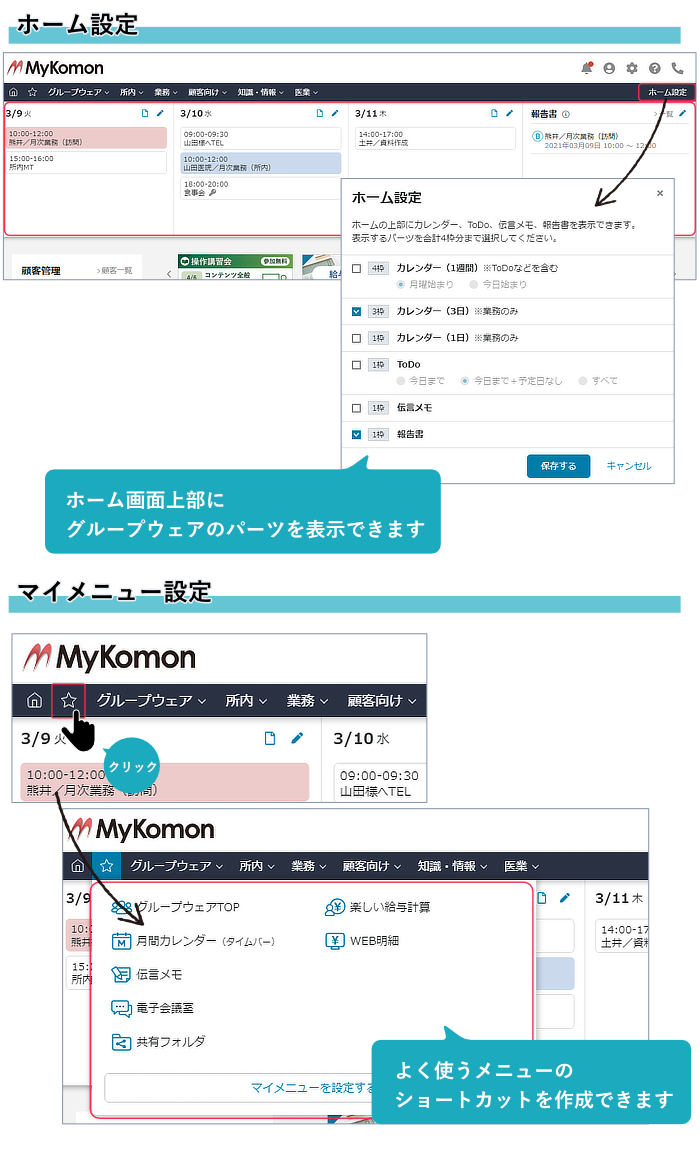 ホーム画面にグループウェアのカレンダーやToDoなどを表示することができます。