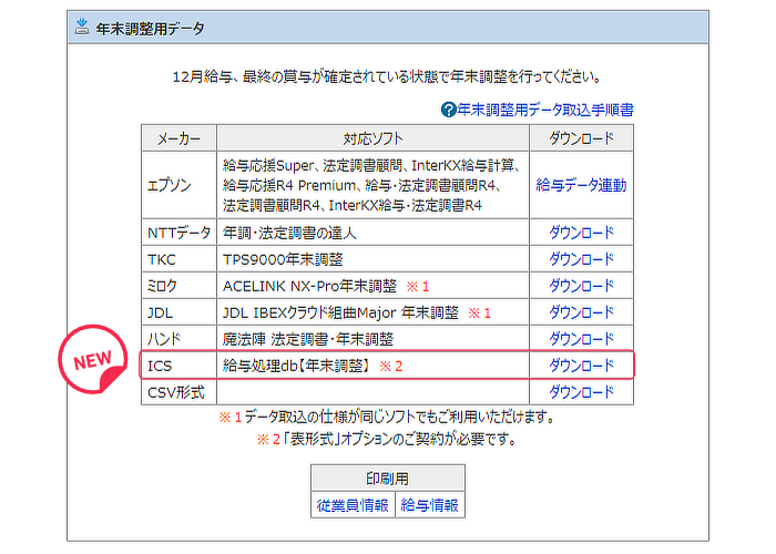 年末調整用データに「ICS」連動用データを追加しました。年末調整連動の対応ソフトは下記の通りです。
