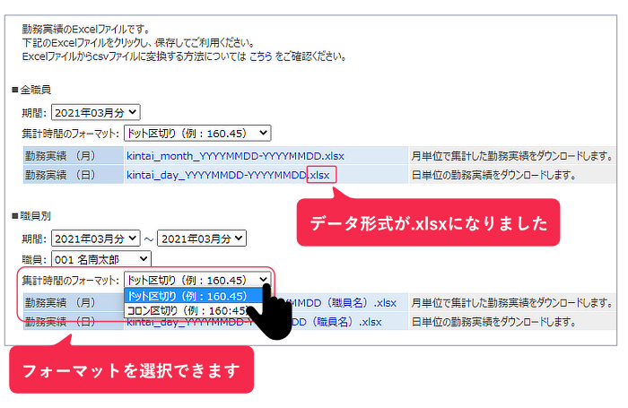 2)勤務実績ダウンロードの集計時間フォーマットが、ドットとコロンから選択できるようになりました。