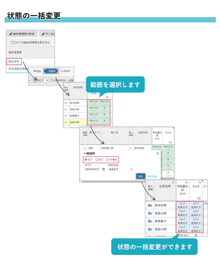 タスクを範囲選択して、状態や予定日、期限、実施担当者等を一括で変更できます。