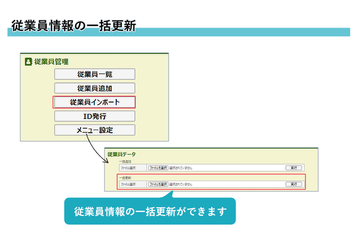 1)インポートにて、従業員情報を一括更新できるようになりました。