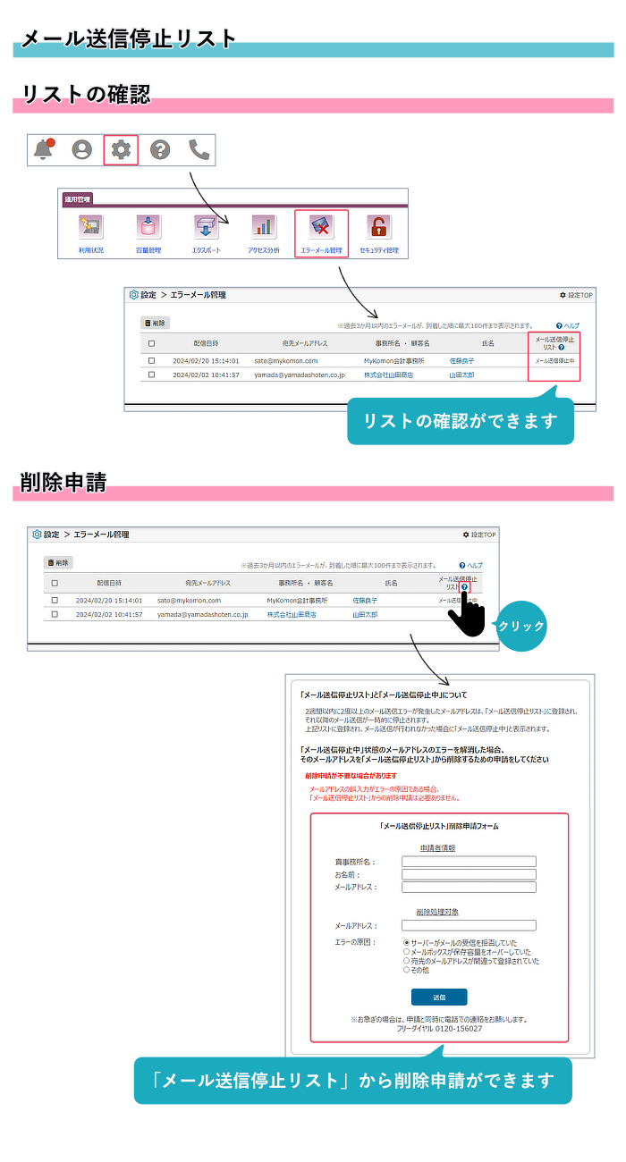 「メール送信停止リスト」に登録された場合、それ以降のメール送信が一時的に停止されます。