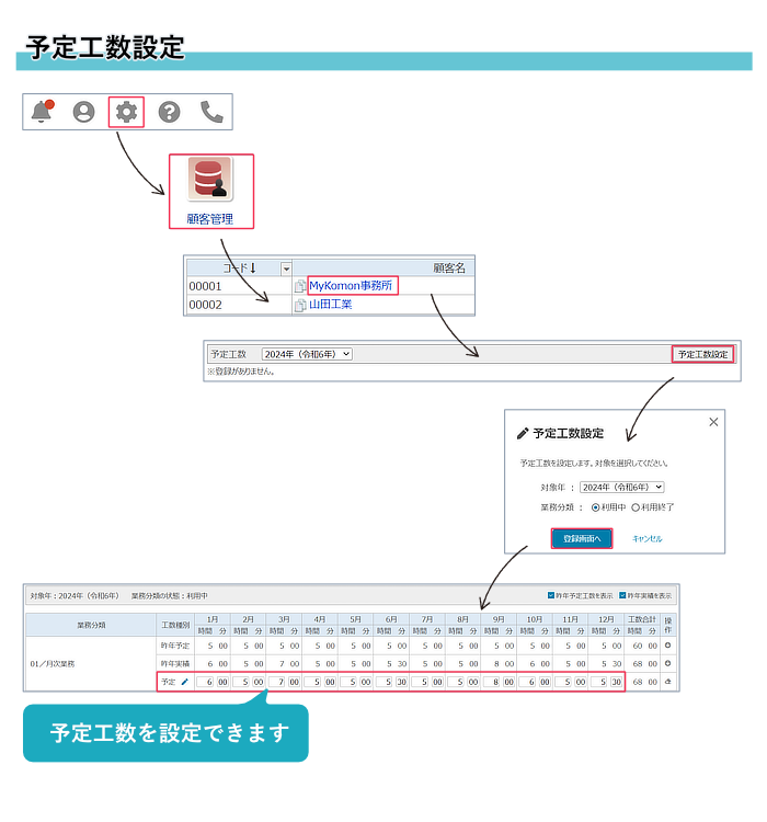 実績工数や過去の予定工数から、予定工数を設定することができます。