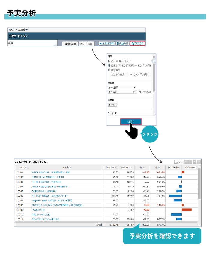 さらに、確定申告などの業務内容ごとに予実分析を行うことも可能です。