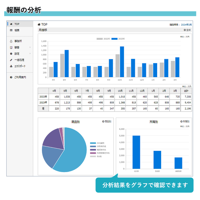 商品別・担当者別・顧客別など様々な角度で分析し、事務所経営に生かすことができます。