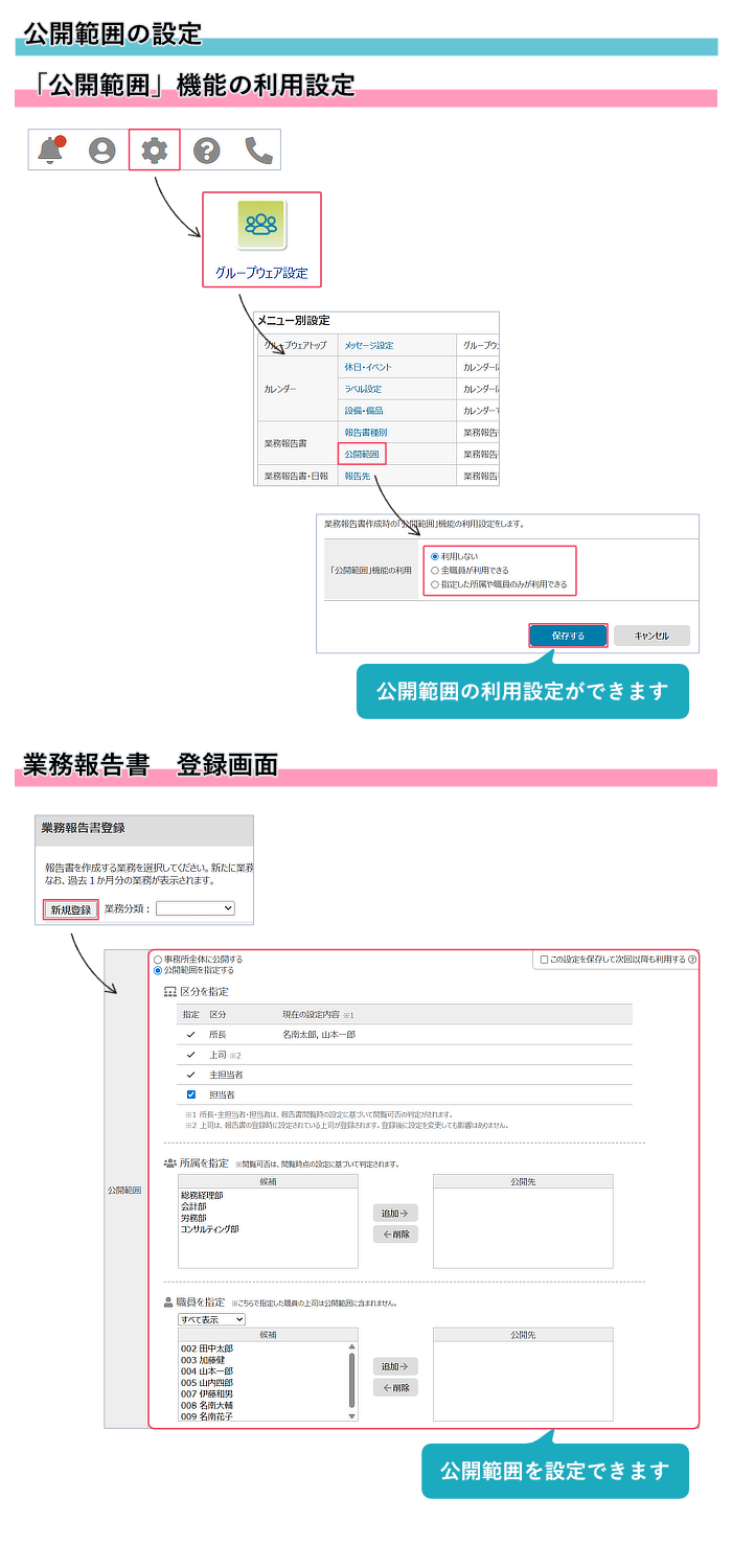 利用設定を行うと、業務報告書の登録画面で公開範囲を設定できます。