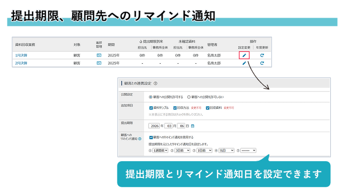 提出期限の設定ができ、資料回収の済んでいない顧問先へリマインド通知も送付できます。