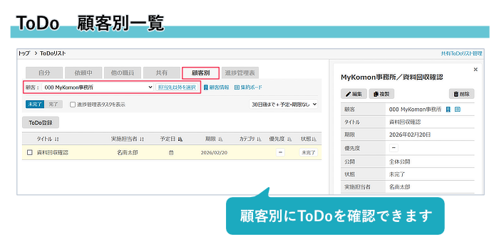 顧客情報に登録した申告情報をもとに、申告期限・納税期限を自動で判定し、タスクを表示します。