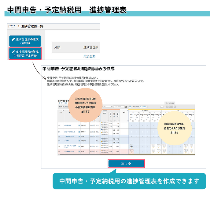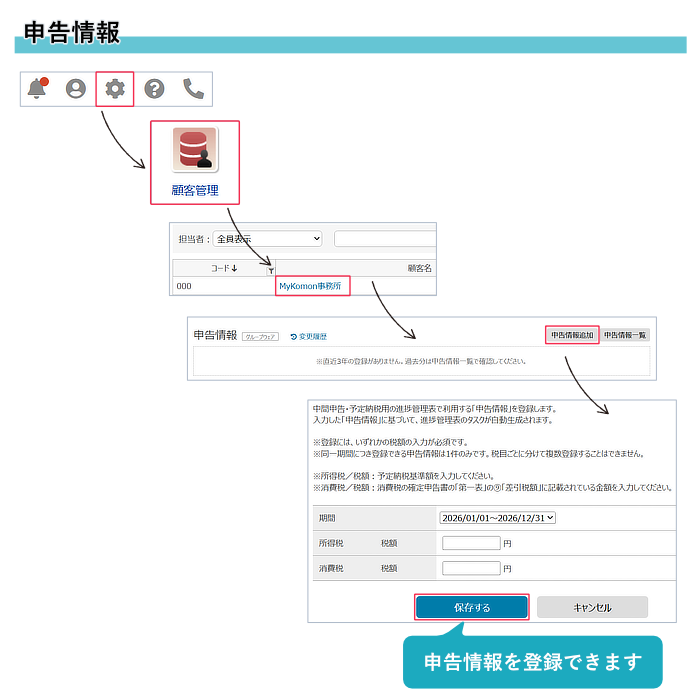 1)中間申告・予定納税用の進捗管理表で利用する「申告情報」を登録できるようになりました。
